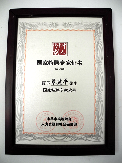 “千人计划”引进的人才,一般应在海外取得博士学位,引进后每年在国内工作一般不少于6个月,并符合下列条件之一:(1)在国外著名高校、科研院所担任相当于教授职务的专家学者;(2)在国际知名企业和金融机构担任高级职务的专业技术人才和经营管理人才;(3)拥有自主知识产权或掌握核心技术,具有海外自主创业经验,熟悉相关产业领域和国际规则的创业人才;(4)国家急需紧缺的其他高层次创新创业人才——这附加的4项条件中,符合1项就行,而景建平全部符合。于是,“千人计划”开始的第二年,他从时任中组部部长李源潮手中接过了“国家千人计划”的镶金证书。