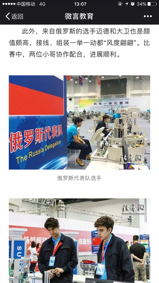 此次比赛中,共有来自中国、俄罗斯、巴基斯坦、印度等8个国家的选手同场竞技,切磋机电一体化操作技术。我院两位“高颜值”帅哥一出场就吸引了众多媒体的眼球,接线、组装,一举一动都配合默契,其优异表现受到了搜狐网、天津职业教育与成人教育网、微言教育(教育部政务新媒体)等多家媒体的关注。