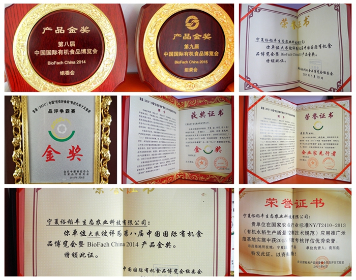 绿色食品或者说生态食品的生产,只要农药、化肥、激素使用不超标即可,也不禁止基因工程;有机食品的生产,绝对不允许使用农药和化肥,一旦使用,我们舌尖虽没法鉴别,专家一检测,昭然若揭。化肥会使土地板结,一亩地化肥成本只要200元;使用牛羊粪等有机肥料,一亩地肥料成本达600元,但土地会改良得越来越好。有机食品生产种子都是特供的,绝对禁止转基因。裕稻丰有机大米受益于贺兰山地区独特的地理气候环境,东北大米只有极少数能够达到裕稻丰的水准。这里的有机水稻种植水平在全国处于什么地位?公司橱窗陈列的几十块奖牌中有两块农业农村部的牌子:“全国有机农业示范基地(水稻)”“全国有机水稻技术标准优秀验证基地”。