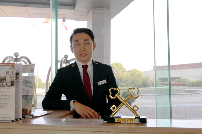 后来才知道,他偶尔听了一次星级酒店来招人的宣讲会,并深深地爱上了酒店管理这一行。毕业实习时他去了常州香格里拉酒店做礼宾——奥,就是老电影里上海滩大酒店为客人开门关门拎行李的门童——客人被他的微笑服务所陶醉,不断地给小费,让他成了班级的富翁,老是被同学“敲竹杠”请吃饭。2011年从业满5年,他有资格申请金钥匙资格,金鸡湖凯宾斯基大酒店看好他的潜质,花大钱送他去培训,同年在四川成都参加了授徽仪式,所在酒店也因此有资格在大堂服务台摆上了一个大约20公分高的金钥匙标志,向客人宣示酒店的品牌。