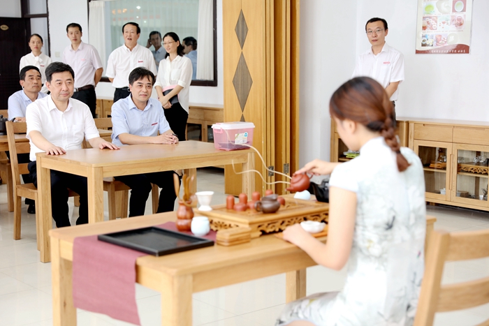 在茶艺实训室,汪书记一行全程观赏了旅游学院的茶艺表演,听取了高级礼仪培训师、茶艺师王雨昕老师的茶艺讲解。汪泉书记认为,旅游类专业是一个非常好的专业,对于提高人民生活质量具有重要支撑作用,也满足了不同学生学习一技之长的愿望,期望学院能够招收更多的学生学习和从事旅游业。