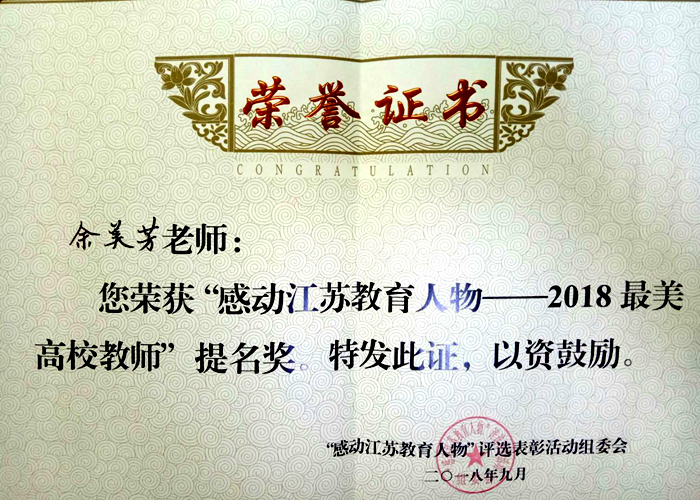 9月7日下午,“感动江苏教育人物—2018最美高校教师”颁奖典礼在南京举行。我院余美芳老师获评“感动江苏教育人物——2018最美高校教师”提名奖。省教育厅副厅长王成斌、省纪委派驻省教育厅纪检组组长霍宝柱、省委教育工委副书记徐子敏等领导出席典礼。