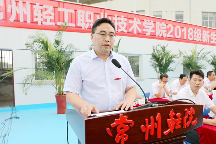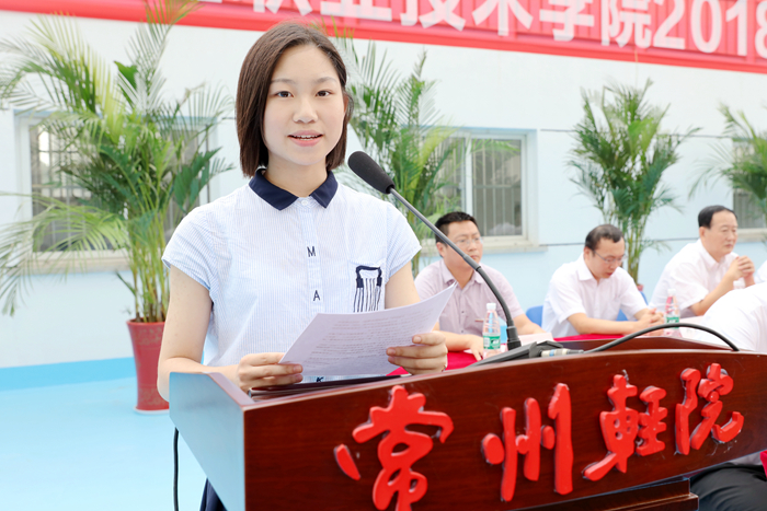 典礼在雄壮的国歌声中拉开序幕。18材料531班谢雨桐同学作为新生代表提出倡议:起步当下,养成良好习惯;尊敬师长、融入轻院大家庭;博采众长,为梦想积蓄力量。机械工程与技术学院院长徐伟作为教师代表发言。他从“奋斗青春、不负芳华”“嚼得菜根、追求卓越”两个方面勉励新生胸怀大志、勤奋学习、积极向上,努力使自己成为技术技能的“王者”,真正具备“与祖国同行”的本领。优秀校友代表——常州壹明堂食品有限公司董事长闫朝恒从自身亲身经历出发,建议师弟师妹积极挑战自我、自强不息、砥砺前行!