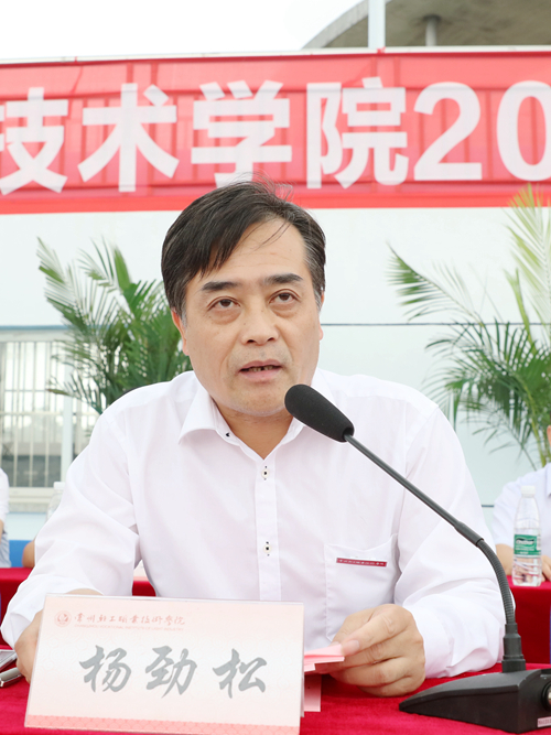杨劲松代表全体师生员工对新同学的到来表示热烈的欢迎和诚挚的祝贺。他详细介绍了学院办学理念、办学条件以及人才培养成绩。希望广大新生保持自信。高职教育也是高等教育,接受高职教育也是个人成长成才的一个重要途径!希望大家向优秀校友、大国工匠邓建军学习,脚踏实地、持之以恒、刻苦钻研,从我做起,从现在做起,只争朝夕,勤学苦读,做到无愧于父母、无愧于老师、无愧于青春。