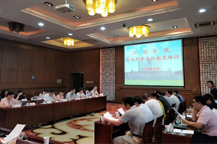 为加强二级学院党政领导班子建设,推进二级学院议事决策的民主化、科学化、规范化,落实巡视整改,9月18日上午,党委办公室组织召开了二级学院党政联席会议制度培训会。院长杨劲松,党办、组织部负责人,各二级学院党总支书记、院长、办公室主任参加了本次会议,会议由党委组织部部长刘建明主持。