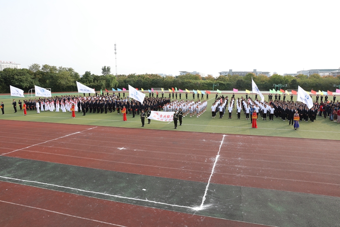 伴随着激昂雄壮的运动员进行曲,国旗护卫队、院旗队、鲜花队、彩旗队以及九个参赛单位的方阵代表队依次步入会场并接受主席台领导检阅,整齐划一的步伐、激情嘹亮的口号,饱满的精神面貌,赢得阵阵掌声。