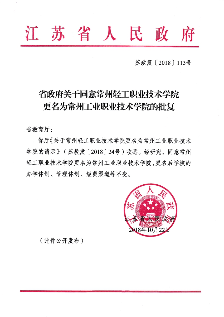 经江苏省人民政府批准,常州轻工职业技术学院正式更名为常州工业职业技术学院。学校自2018年10月22日起正式启用新校名。