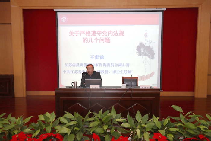 11月20日下午,我院党委中心组(扩大)学习暨“清风讲堂”讲座在教学楼3201报告厅举行,讲座邀请江苏省委党校教授王世谊作了题为《关于严格遵守党内法规的几个问题》的报告,全体校领导出席,科级以上干部、各党总支委员、各党支部书记和支部委员、党风廉政建设信息联络员参加本次讲座,讲座由校长杨劲松主持。