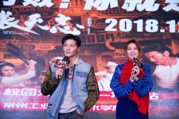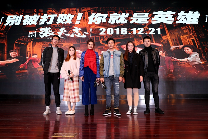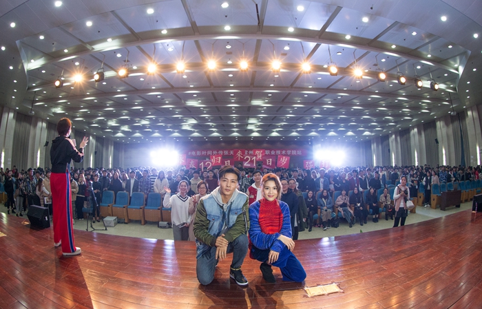 分享会开始之初,为了让期待已久的观众们一睹为快,现场提前播放了12月21日才正式上映的功夫巨作《叶问外传:张天志》。在同学们还沉浸在影片的情节中时,惊喜出现了!在电影中饰演男主角“张天志”的影视演员张晋和饰演“娜娜”一角的周秀娜空降千人报告厅,引起台下热烈的欢呼声。