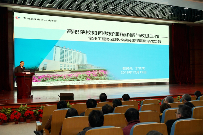 12月19日下午,我校诊改高级实务研修班举行“课程层面诊改”专题报告会。邀请了常州工程职业技术学院教务处副处长丁才成作题为《用课程诊改带动教学质量提升》的专题报告。校长杨劲松、全体中层干部及教职工参加了报告会。报告会由副校长姚庆文主持。