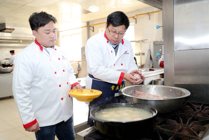 随后,缪昌武来到食堂,换上大厨的衣服,与厨师们一起做肉圆,为全校教职员工加餐。缪昌武往肉糜里浇鸡汤、放调料、撒葱花、加荸荠粒、打鸡蛋后再开始和肉糜,直到肉糜有了点劲道,再搓成肉圆,放入鸡汤里煮沸,这样的肉圆既入味,又有嚼劲。肉圆代表团团圆圆、和和美美,在热锅中沸腾的肉圆,更象征着大家红红火火的好日子。缪昌武希望把关怀和温暖送到女教工们的心中,让学校成为广大女教工温暖的家。