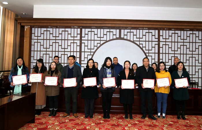 校团委副书记嵇天培宣读了《关于表彰学院2018年度优秀社团指导老师的决定》,随后各二级学院副书记依次为2018年度“优秀社团指导老师”获得者颁发证书。接着, 读者协会殷新叶老师就社团介绍、2018年度活动回顾、社团荣誉、社团活动思路效果及展望等四个方面做交流发言。