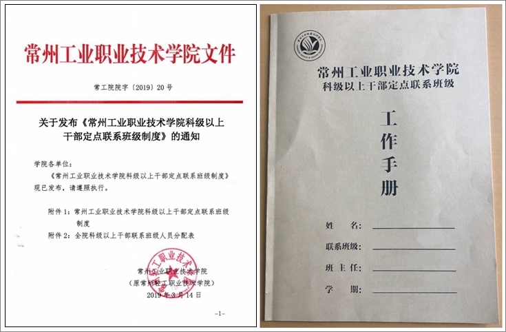 为进一步贯彻落实全国全省高校思想政治工作会议精神和中共教育部党组织关于加强和改进高校领导干部深入基层联系学生工作的文件精神,构建“全员育人、全方位育人、全过程育人”的大思政格局,我校出台了《常州工业职业技术学院科级以上干部定点联系班级制度》,全面启动科级以上干部定点联系班级工作,校党委书记缪昌武等7位校领导均参与联系班级工作。