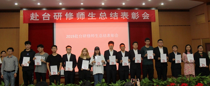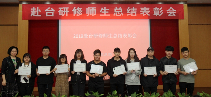 下午,学校举办赴台研修师生总结表彰会。学工处处长柏铁山、经管学院副院长孙洁和海外学院副书记潘逸分别为2018年我校赴台研修的师生和龙华科大访学团的师生颁发了证书。龙华科技大学学务长王延年向在场的嘉宾和师生们详细介绍了近年来两校在师生、专业等多方面的互动与交流情况,希望双方今后在产学研和学术交流方面能进一步深入开展合作。