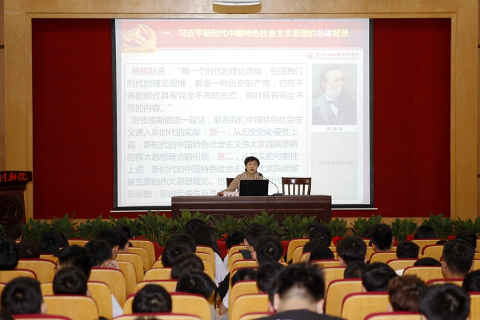 为深入学习贯彻习近平新时代中国特色社会主义思想和十九大精神,让广大学生能够进一步学习领会习近平新时代中国特色社会主义思想的丰富内涵,更好地担负起中国特色社会主义建设者和接班人的重任,我校举办校领导深入大学生宣讲十九大精神培训班。6月5日下午,副校长蒋新萍以《新时代 新使命——习近平新时代中国特色社会主义思想产生的时代背景》为题做开班第一讲。报告会由校党委委员、组织部部长刘建明主持,近300名学生参加了培训。