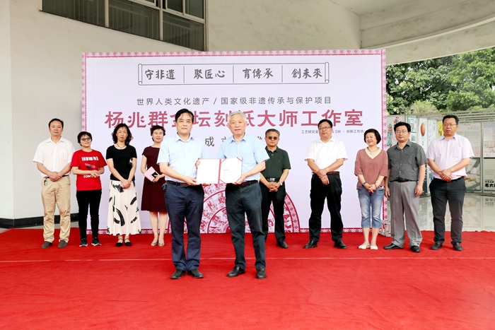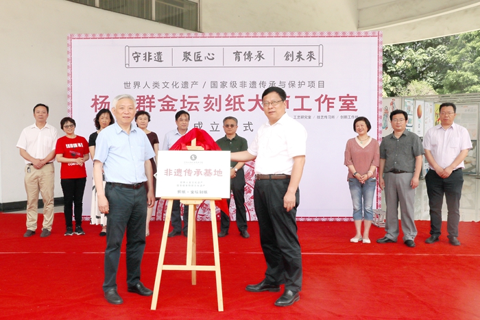 6月24日上午,“国家级非物质文化遗产项目金坛刻纸”杨兆群大师工作室成立仪式在我校举行。金坛刻纸传承人、江苏省工艺美术大师杨兆群,江苏省工艺美术行业协会监事会主席何祖伟,我校党委书记缪昌武、校长杨劲松、副校长蒋新萍及相关职能部门负责人出席开幕式,开幕式由副校长吴丽云主持。