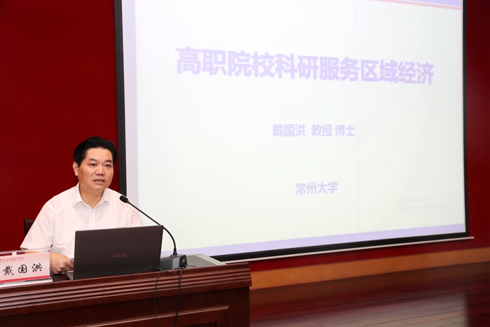 常州大学党委副书记、副校长戴国洪作题为《高职院校科研服务区域经济》的报告。戴国洪从纵向科研和横向科研、个人科研与团队科研、科研与教学、科研与学科专业的关系入手,阐释了科研对提升教学能力、促进教学内容更新、促进教学改革、提高人才培养质量的重要作用,拓宽、深化了大家对科研的认识。戴国洪指出,科研要紧扣学校实际和区域经济社会发展目标,动态调整科研方向,深入企业,组建团队,加强整体规划。