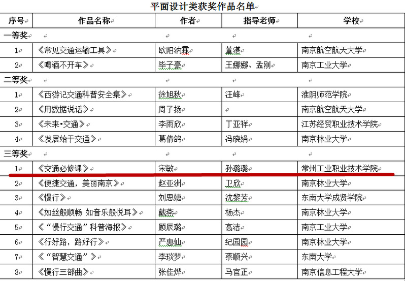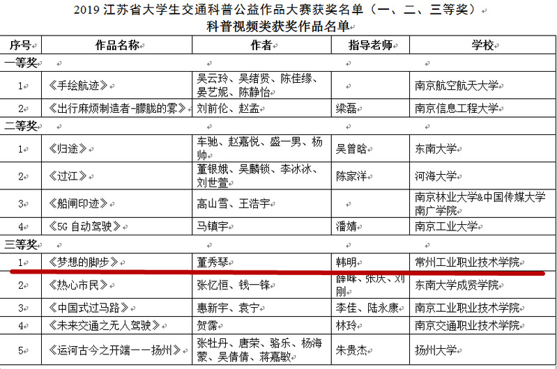 近日,2019年江苏省大学生交通科普公益作品大赛结果揭晓。我校董秀琴的作品《梦想的脚步》(指导老师:韩明)荣获科普视频类三等奖,宋敏的作品《交通必修课》(指导老师:孙璐璐)荣获平面设计类三等奖。