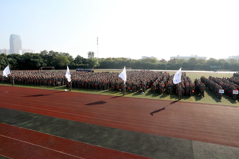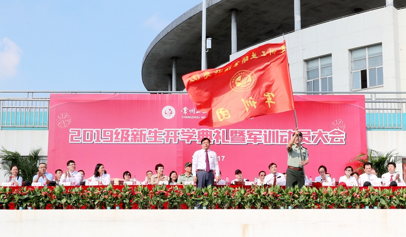 缪昌武向新训团授团旗,勉励全体新生笃学苦练、强健体魄,发奋成才、奉献社会,为2019级新生军训拉开了序幕。