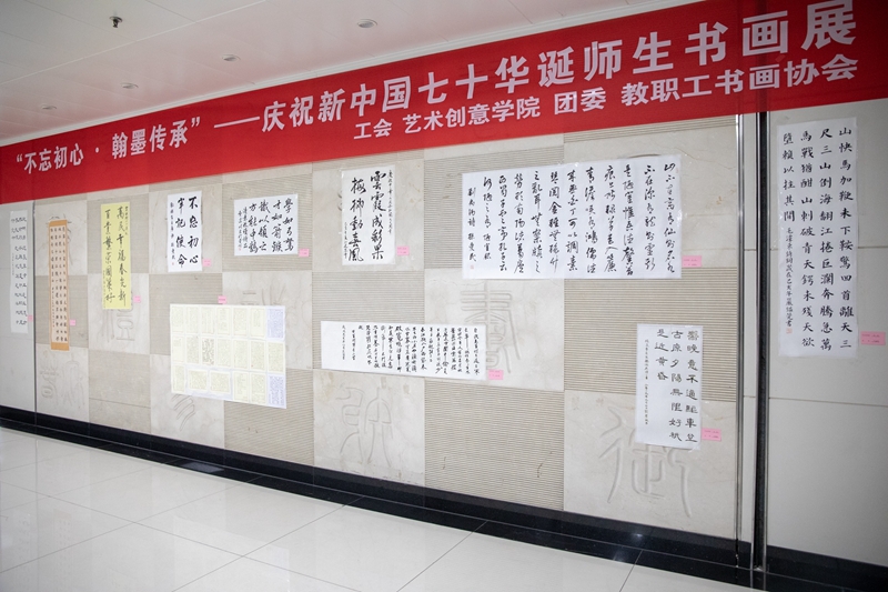 为庆祝中华人民共和国成立70周年,展示我校师生奋发进取的精神风貌,由校工会牵头,艺术创意学院、校团委协办,教职工书画协会承办的“不忘初心•翰墨传承”师生书画展于9月25日在图文楼一楼大厅如期展出。