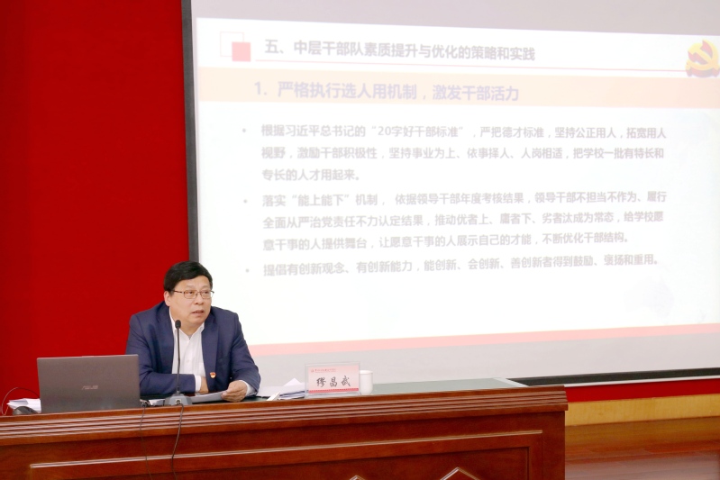 随后,缪昌武结合学校实际,从我校中层干部队伍现状、中层干部队伍存在的问题、高职院校中层干部能力素养要求、中层干部队伍素质提升与优化的策略和实践方面,详细分析了学校干部队伍存在的问题,指出了提升途径。他认为高职院校的中层干部,政治上要有高度、工作上要有力度、视野上要有宽度、知识上要有厚度、思想上要有深度,而“严格执行选人用机制,激发干部活力”“优化干队伍结构,大力选拔培养年轻干部”“加强学习,不断提高执行能力”“强化培训,注重培养专业能力”“开展轮岗交流,强化担当作为本领”“严肃党内政治生活,建设良好政治生态”则是提升和优化中层干部队伍素质的较好途径。