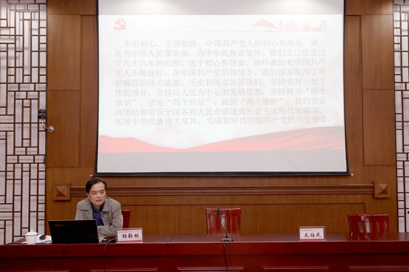 授课中,杨劲松结合自身经历,回顾了自己入党时的初心,与大家分享了“守初心,担使命”的感悟。他认为,守初心就是要始终坚守对党的绝对忠诚的初心,始终坚守对事业的崇敬的初心,始终坚守对名利的淡泊的初心,始终坚守对生活的平常的初心。初心永驻,使命在肩。他表示,作为一名教育工作者,我们的使命,就是要坚持把党的教育方针全面贯彻到学校工作各方面,落实培养德智体美全面发展的社会主义建设者和接班人的根本任务,把立德树人作为检验学校一切工作的根本标准。