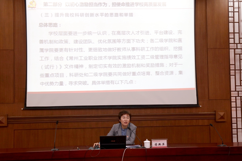 11月4日,学校党委委员、副校长蒋新萍为各二级学院院长、科研团队负责人、科研岗教师、博士以及科研处人员,作了题为“守初心、担使命,提升科研创新水平,推进学校高质量发展”的主题教育专题党课。