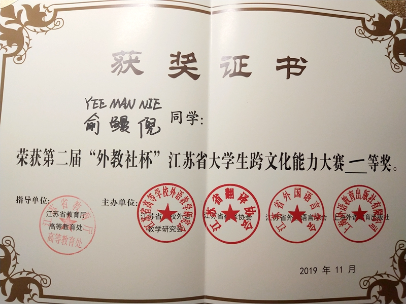 11月20日,第二届“外教社杯”江苏省大学生跨文化交际能力大赛决赛在扬州大学落下帷幕,我校2018级留学生俞鳗倪获得留学生组一等奖。