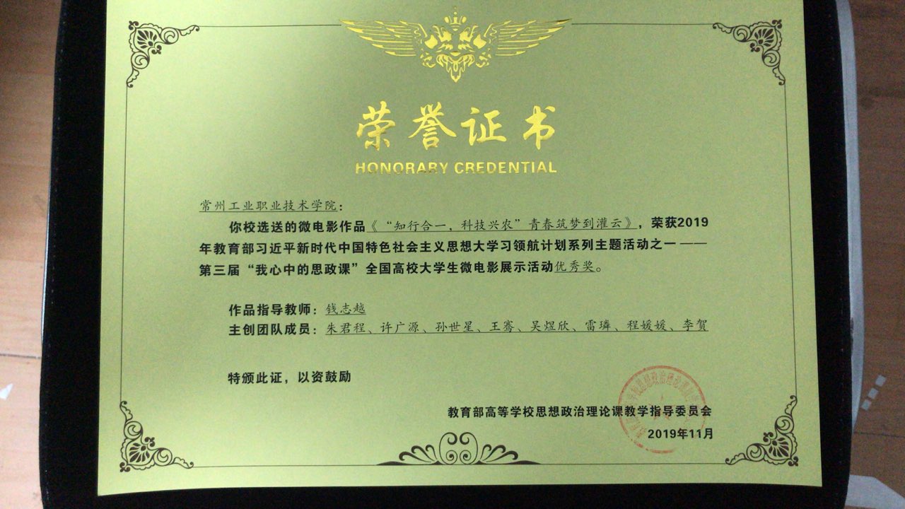近日,教育部高校思政课教学指导委员会主办的第三届“我心中的思政课”全国高校大学生微电影展示活动颁奖典礼在武汉大学举行。我校微电影作品《“知行合一、科技兴农”青春筑梦到灌云》荣获优秀奖。