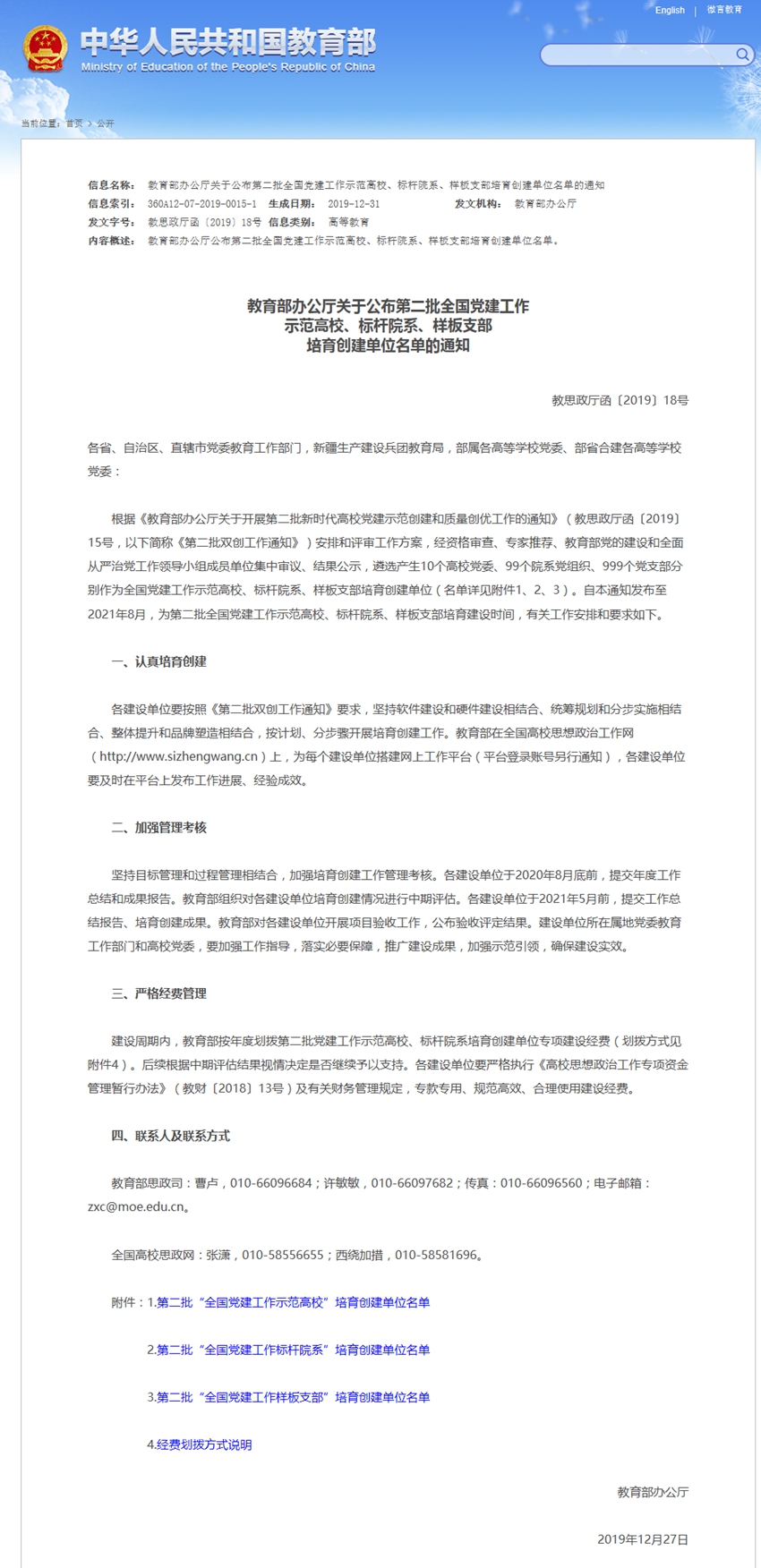 近日,教育部办公厅公布了第二批全国党建工作示范高校、标杆院系、样板支部培育创建单位名单,我校材料工程学院学生党支部入选第二批“全国党建工作样板支部”培育创建单位。