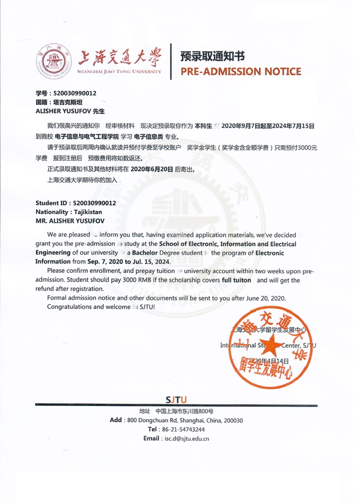 4月13日,从上海交通大学招生办获悉,我校2017级塔吉克斯坦籍留学生YUSUFOV ALISHER(中文名:王真)顺利通过入学考试,被上海交通大学录取为2020级本科生,并获得一等奖学金。