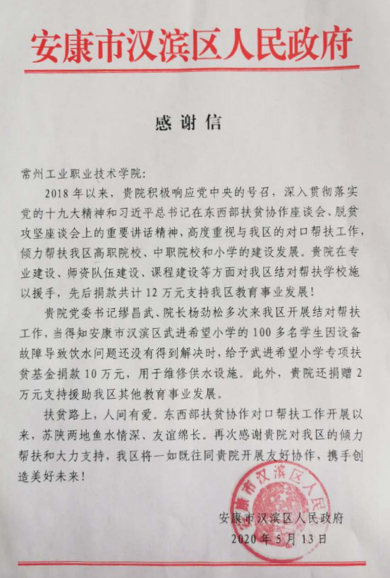“贵院在专业建设、师资队伍建设、课程建设等方面对我区结对帮扶学校施以援手,先后捐款共计12万元支持我区教育事业发展!”5月13日,我校收到一封来自陕西省安康市汉滨区人民政府的感谢信,信不长,但字里行间真情满满,每个字都承载着受援地区最真挚的感激之情。短短的一封感谢信,是结对帮扶受援方对我校扶贫工作的最大褒奖,反映了我校各项帮扶举措落到了实处,扎实帮扶、认真帮扶取得了切实成效,也传递了党中央对贫困地区的真情关怀。