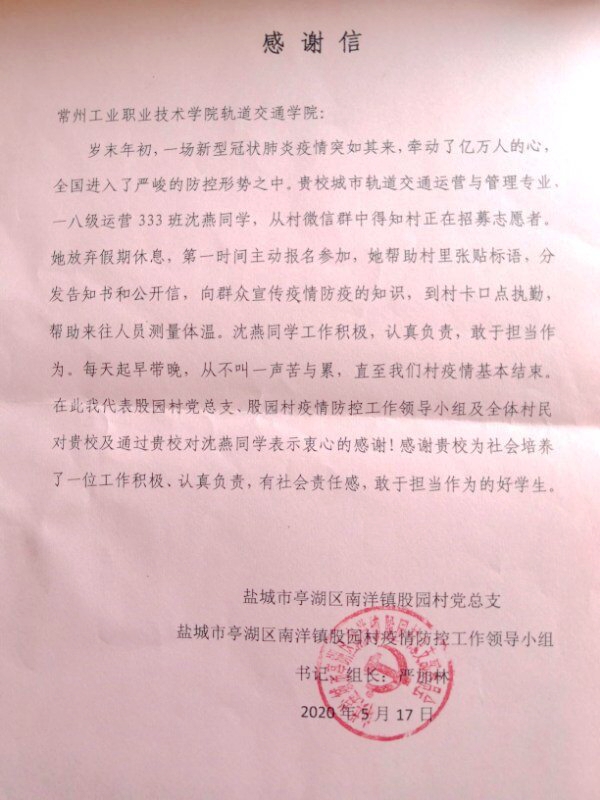 “感谢贵校为社会培养了一位工作积极、认真负责,有社会责任感,敢于担当作为的好学生!”近日,我校收到了来自盐城市亭湖区南洋镇股园村支部委会的一封感谢信,信中表达了对我校轨道交通学院沈燕同学的感谢,同时对她作为青年志愿者在疫情工作中的表现给予了充分肯定。