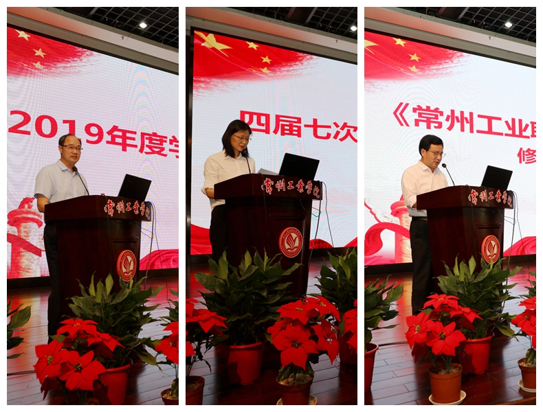 会上,代表们听取和审议了2019年度院长工作报告、2019年度学院财务工作报告、学院四届七次教代会提案工作报告;听取了第四届“两代会”代表增补及第四届教代会提案工作委员会委员调整情况报告,审议和通过了第四届“两代会”代表增补人选和第四届教代会提案工作委员会委员调整人选;听取并审议通过了《常州工业职业技术学院章程》修改说明报告;听取《常州工业职业技术学院奖励性绩效工资分配办法》修改说明报告,并以无记名投票的方式通过了《常州工业职业技术学院奖励性绩效工资分配办法》。