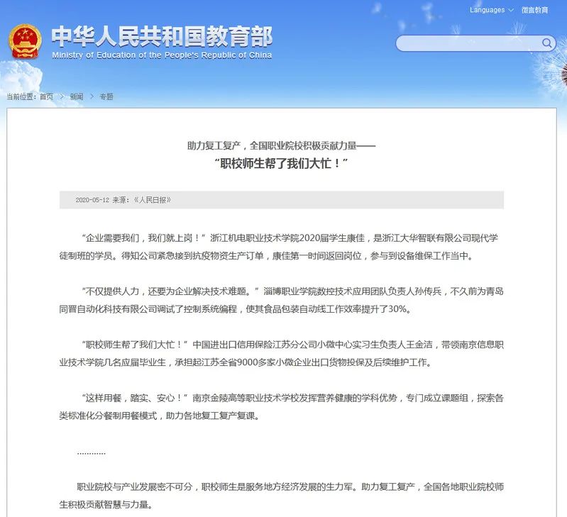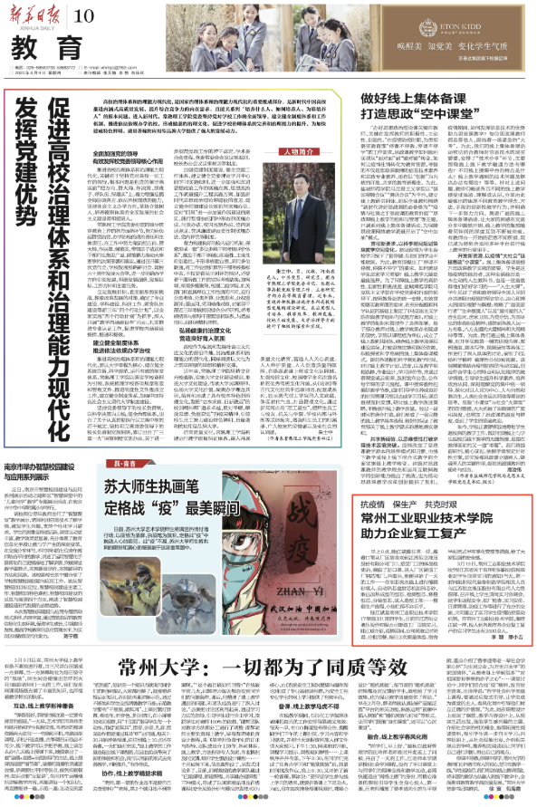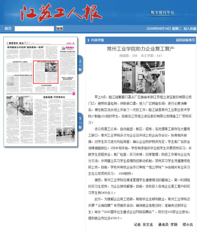 近日,《人民日报》(5月12日第十六版教育)发表长篇通讯稿《助力复工复产,全国职业院校积极贡献力量——“职校师生帮了我们大忙!”》,整版报道了全国职业院校支持企业复工复产、激活企业内生动力的相关情况。我校校企合作订单班“恒立学院”全体学生疫情期间在企业顶岗实习,百分之百到岗,助力企业复工复产的先进事迹被《人民日报》大篇幅报道。相关报道还被新华社、人民网、中青在线、中华人民共和国教育部官网、江苏省教育厅官网等多家国家级媒体和各级政府网站刊登或全文转载。