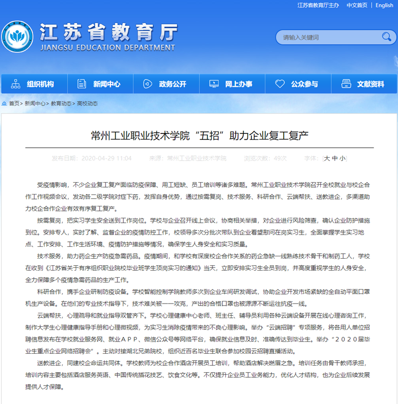 据悉,该新闻报道文段来源于我校党委宣传部李颖老师和现代装备制造学院缪小吉老师合作撰写的长篇通讯稿《常州工业职业技术学院实习生助力企业复工复产》,该文在我校官方网站和官微及时发布,前期已被《新华日报》《江苏工人报》《常州日报》等纸质媒体和中国高职高专教育网、中国江苏网、交汇点新闻等网络媒体刊登或转载。新闻报道充分体现了疫情环境下我校高度重视毕业生顶岗实习和充分就业,危难时刻为校企合作企业提供人才与智力支撑,切实关心校企合作企业及时恢复生产,更表明了我校不断深化产教融合、校企合作培养高质量复合型技术技能人才的办学理念和职教情怀。