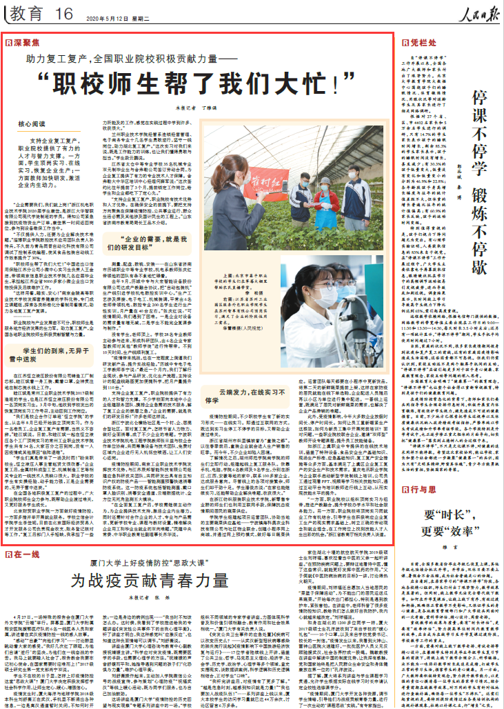 在全国各地积极复工复产的过程中,广大职业院校师生全力参与,既帮助企业渡过难关,又更好服务学生成长。