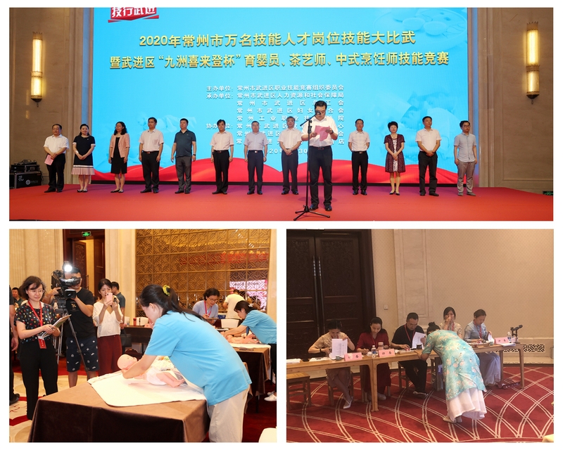 7月30日,由武进区人力资源和社会保障、总工会、妇联和我校联合举办的2020年武进区“九洲喜来登杯”育婴员、茶艺师、中式烹饪师技能大赛在武进开幕。江苏省人力资源和社会保障厅副厅长顾潮,常州市政协副主席、总工会主席徐伟南, 我校校长杨劲松等领导出席开幕式。