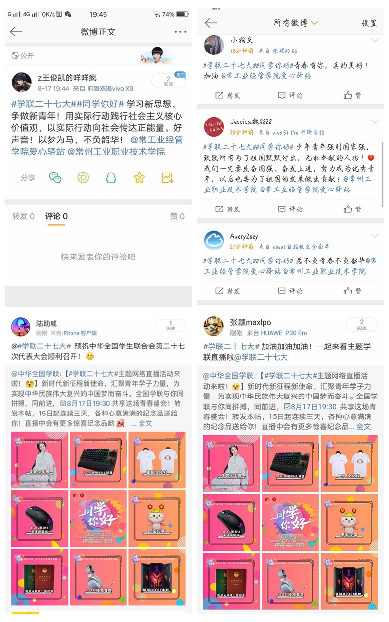 除了观看直播,在大会预热阶段,我校青年积极参与“学联二十七大”“同学你好”等话题讨论,通过文字、图片、视频等方式祝福大会胜利召开,热议习近平总书记贺信精神,表达在矢志奋斗中谱写新时代青春之歌的热情和决心。