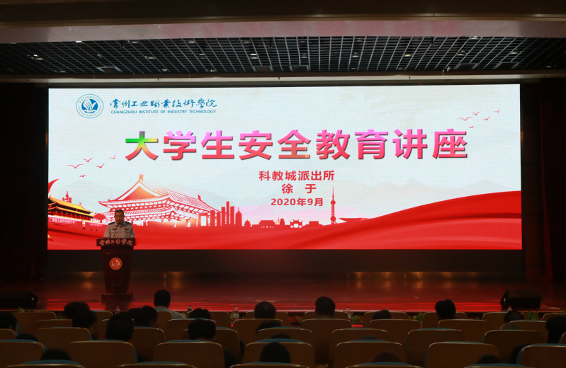 为切实增强学生的安全防范意识,提高学生在疫情防控期间自我保护能力, 9月16日下午,学校保卫处邀请常州科教城派出所警官徐于开展安全教育讲座。讲座由保卫处处长柏铁山主持,主会场设在图文楼报告厅,各教室设立分会场,共计3600余人参加此次活动。