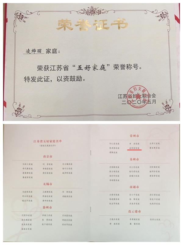 以榜样为光荣、以模范为骄傲。我校教师凌烨丽家庭荣获“江苏省五好家庭”实至名归,其家庭是名副其实的学习之家,也是爱与幸福之家,进一步彰显了我校大力弘扬“孝老爱亲,感恩知责”传统文化的良好成效,也映射了我校全体师生“育养匠心,幸福人生”的共同愿景。