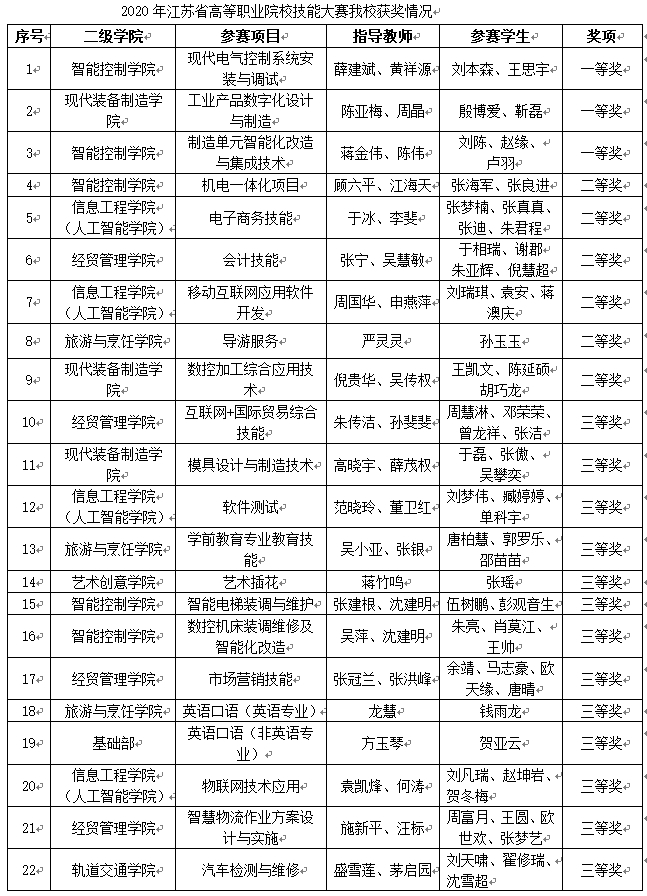 大赛点亮人生,技能铸就梦想。9月19-30日,由江苏省教育厅主办的2020年江苏省高等职业院校技能大赛在全省各赛区顺利举行,我校获得一等奖3项,二等奖6项,三等奖13项的好成绩,具体获奖名单如下: