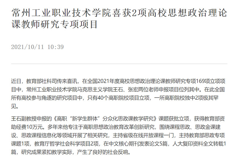 新江苏-常州工业职业技术学院喜获2项高校思想政治理论课教师研究专项项目