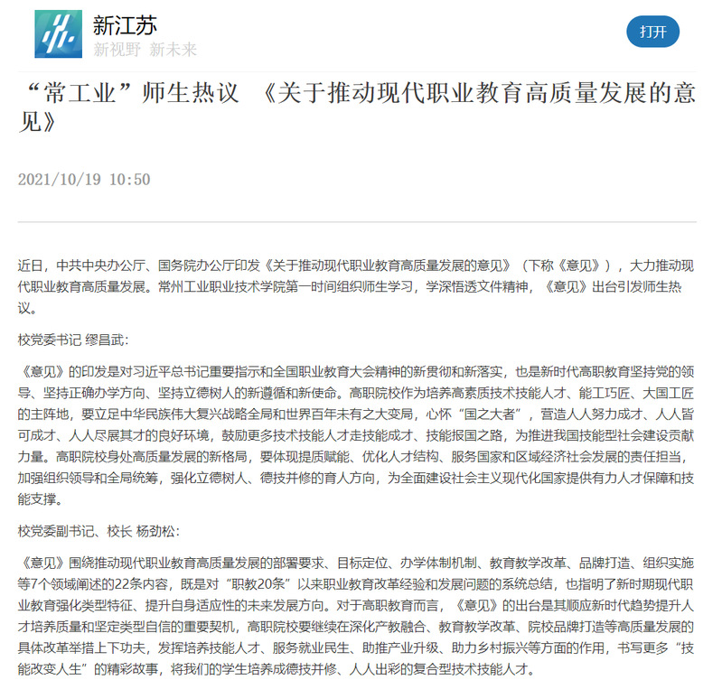 新江苏-“常工业”师生热议 《关于推动现代职业教育高质量发展的意见》