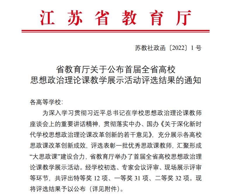 近日,江苏省教育厅公布首届全省高校思想政治理论课教学展示活动评选结果,我校马克思主义学院张永林老师荣获一等奖。