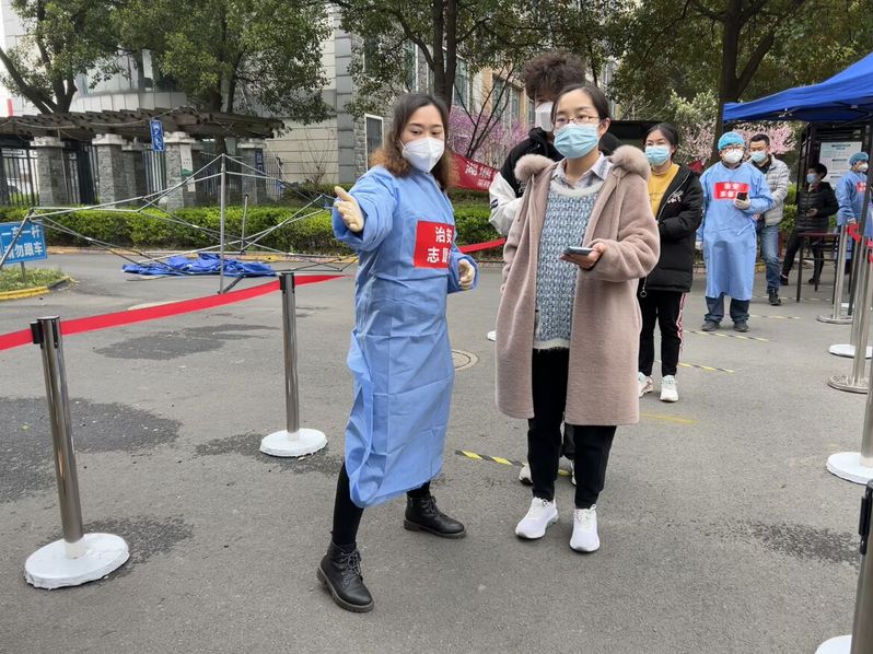 3月19日是马静在湖塘镇北街社区做治安志愿者的第一天。早上5:40,她就在社区核酸检测现场维持秩序,安排居民间隔1米排队进入检测通道,引导居民提前打开核酸采样码,帮助老人、小孩、孕妇和腿脚不便的人士到指定地点检测等。尽管嗓子沙哑了,腿脚酸软了,但看到大家在自己的疏导安排下很快完成核酸检测工作,自豪感油然而生。