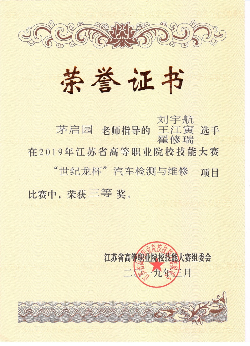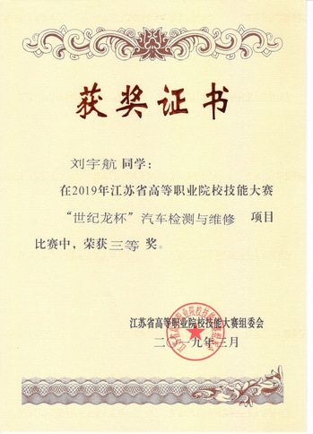 学生积极参加各类技能技术比赛,获得江苏省职业院校技能大赛“汽车技术”赛项2019年、2020年三等奖