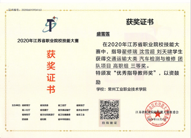 盛雪莲老师获得江苏省职业院校技能大赛优秀指导教师奖