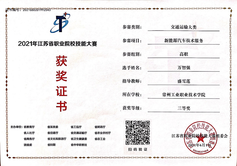 学生积极参加各类技能技术比赛,获得江苏省职业院校技能大赛新能源汽车技术三等奖。