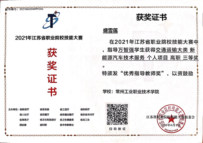 盛雪莲老师获得江苏省职业院校技能大赛优秀指导教师奖